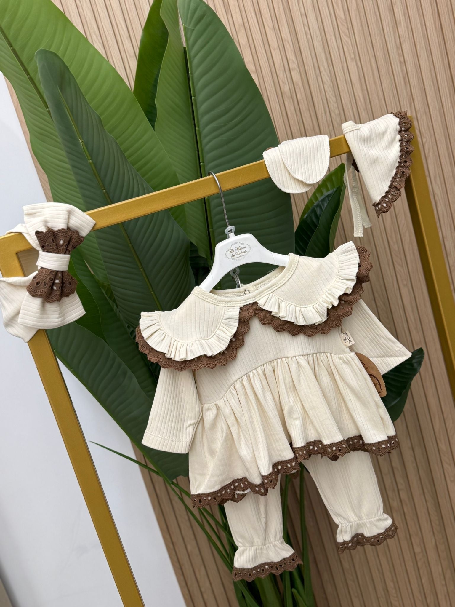 Coordinato in cotone nuova collezione primavera estate comprende tutina spezzata fascia bavetta e muffoline