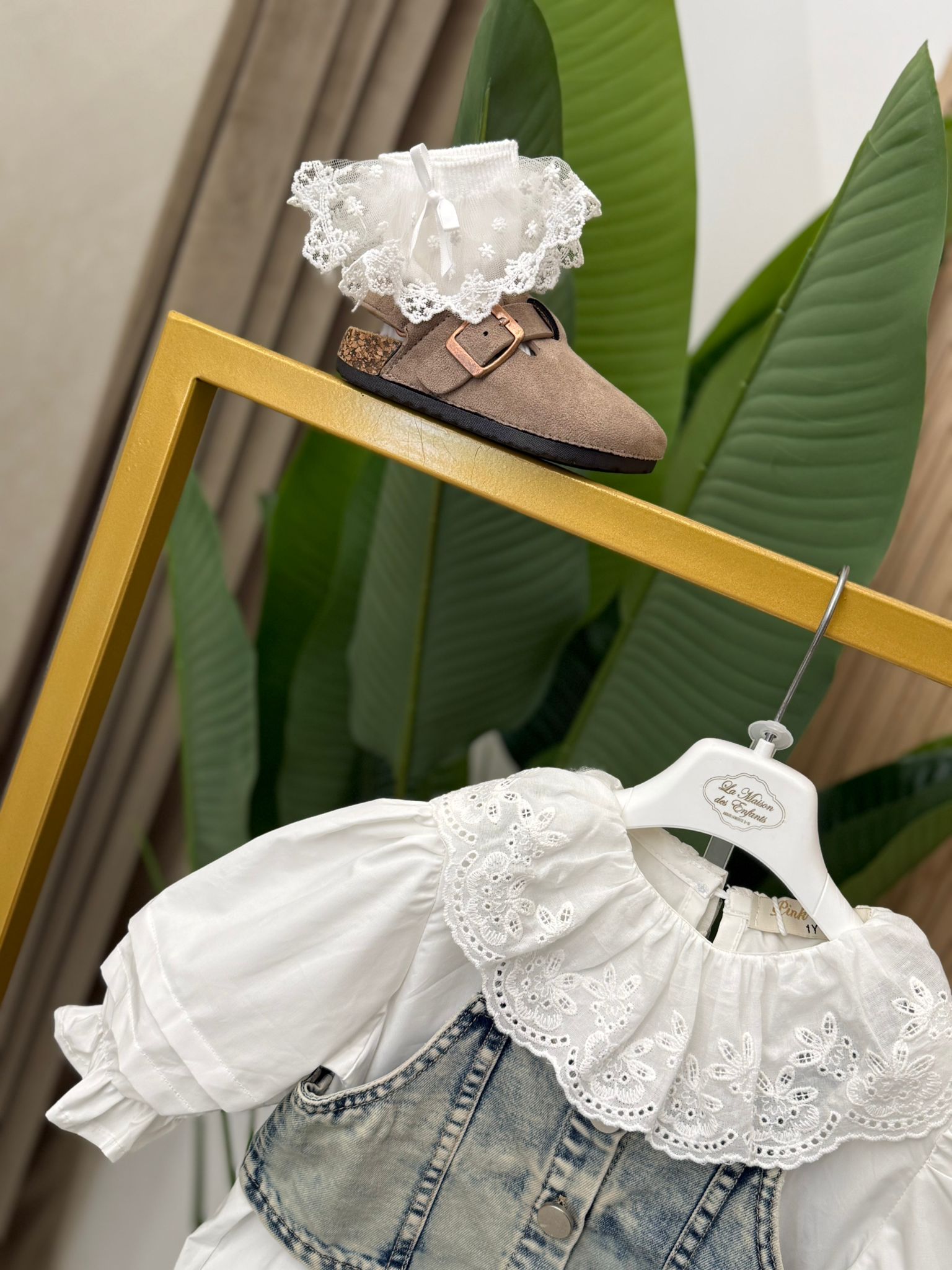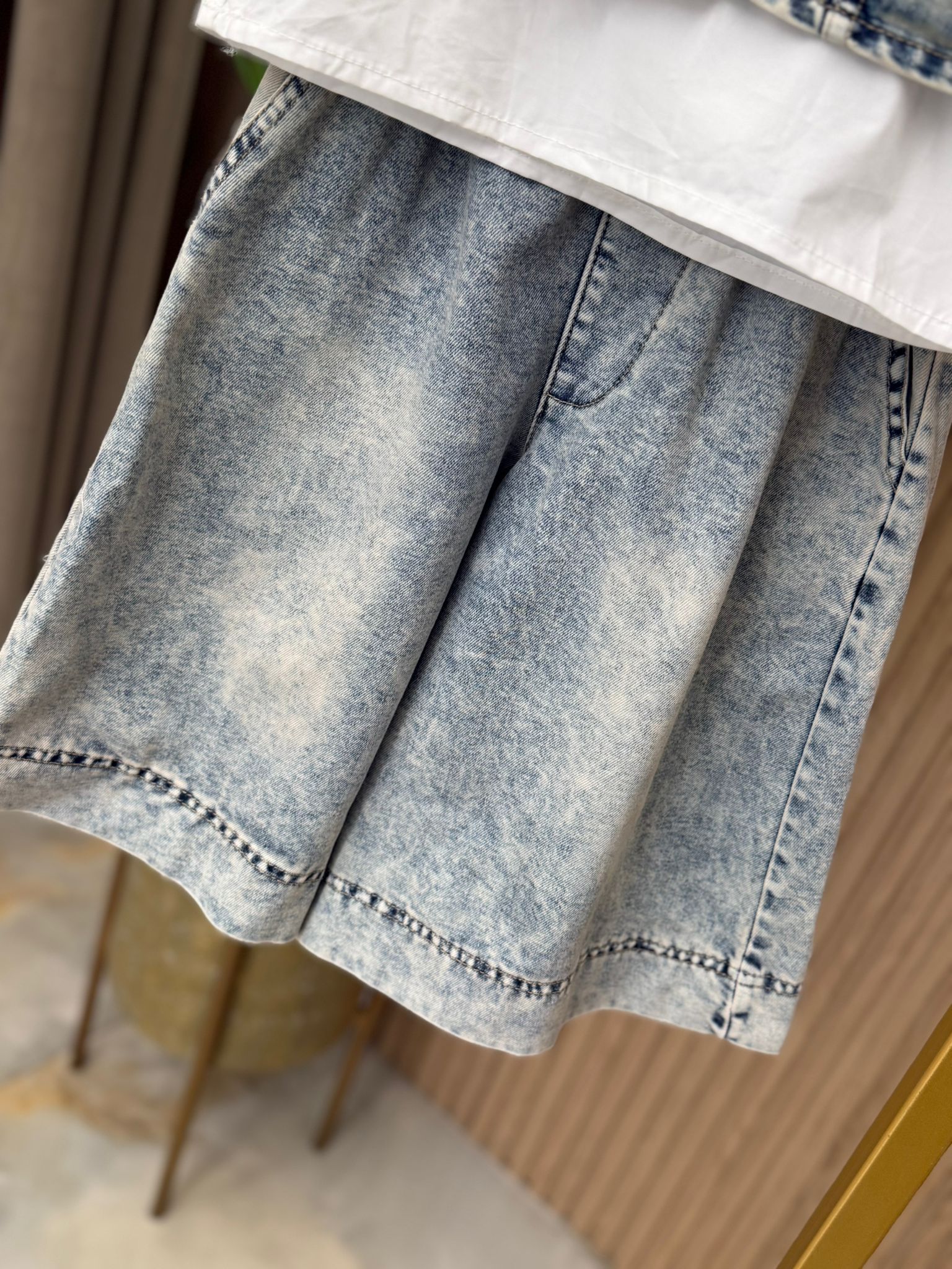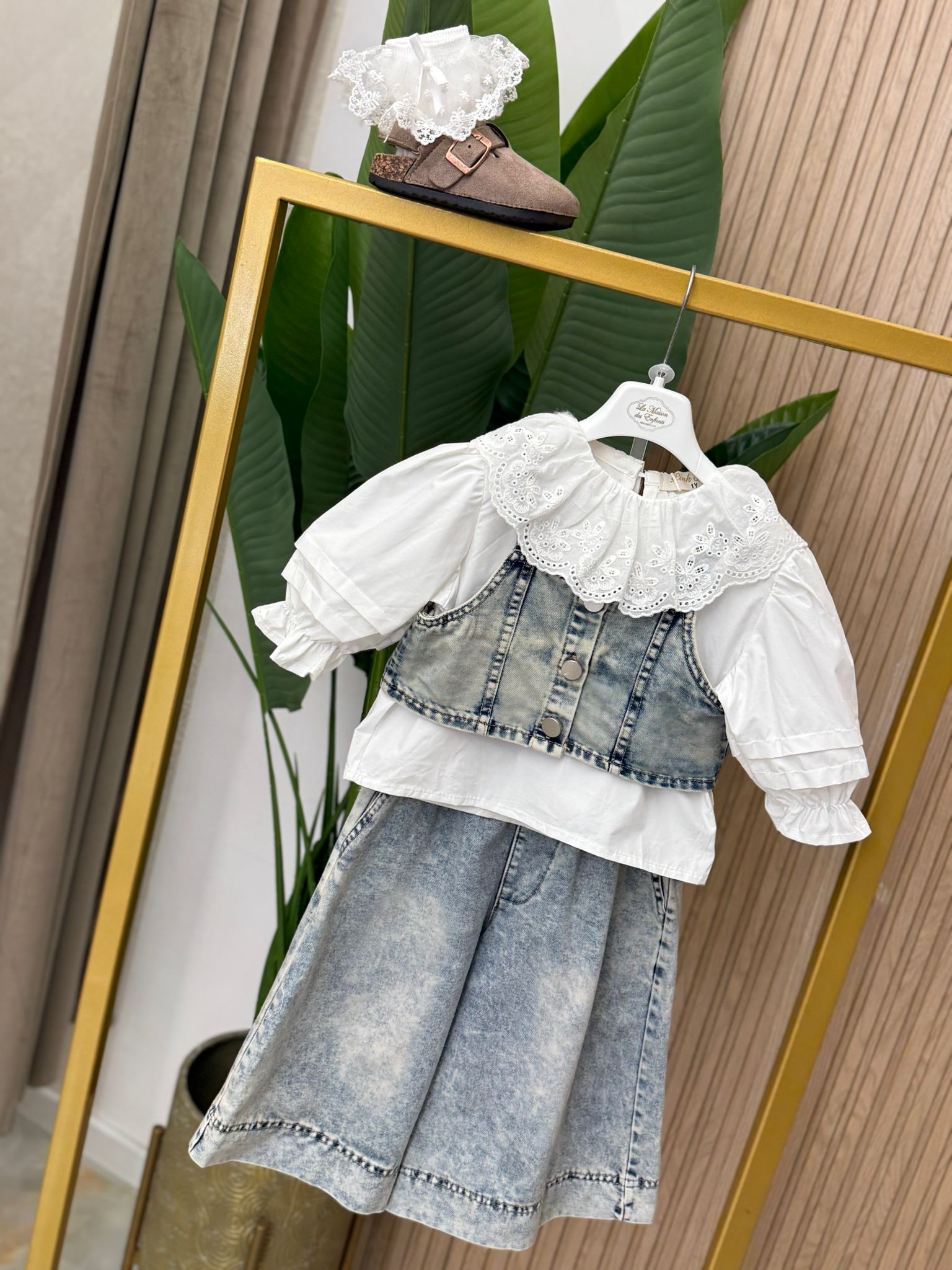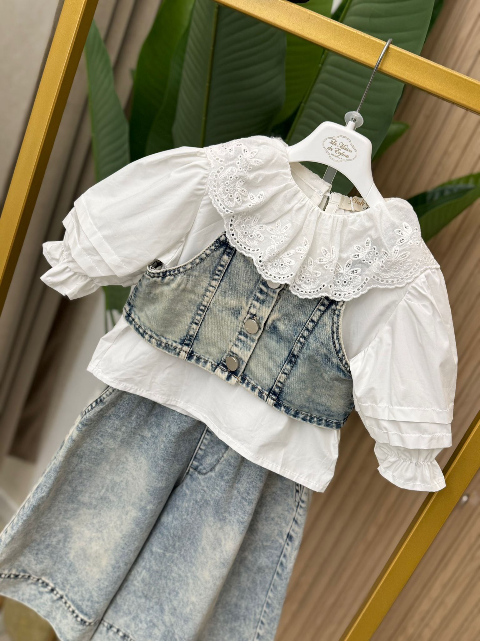 Coordinato 3 pz comprende jeans largo con elastico in vita top in denim e camicia in cotone