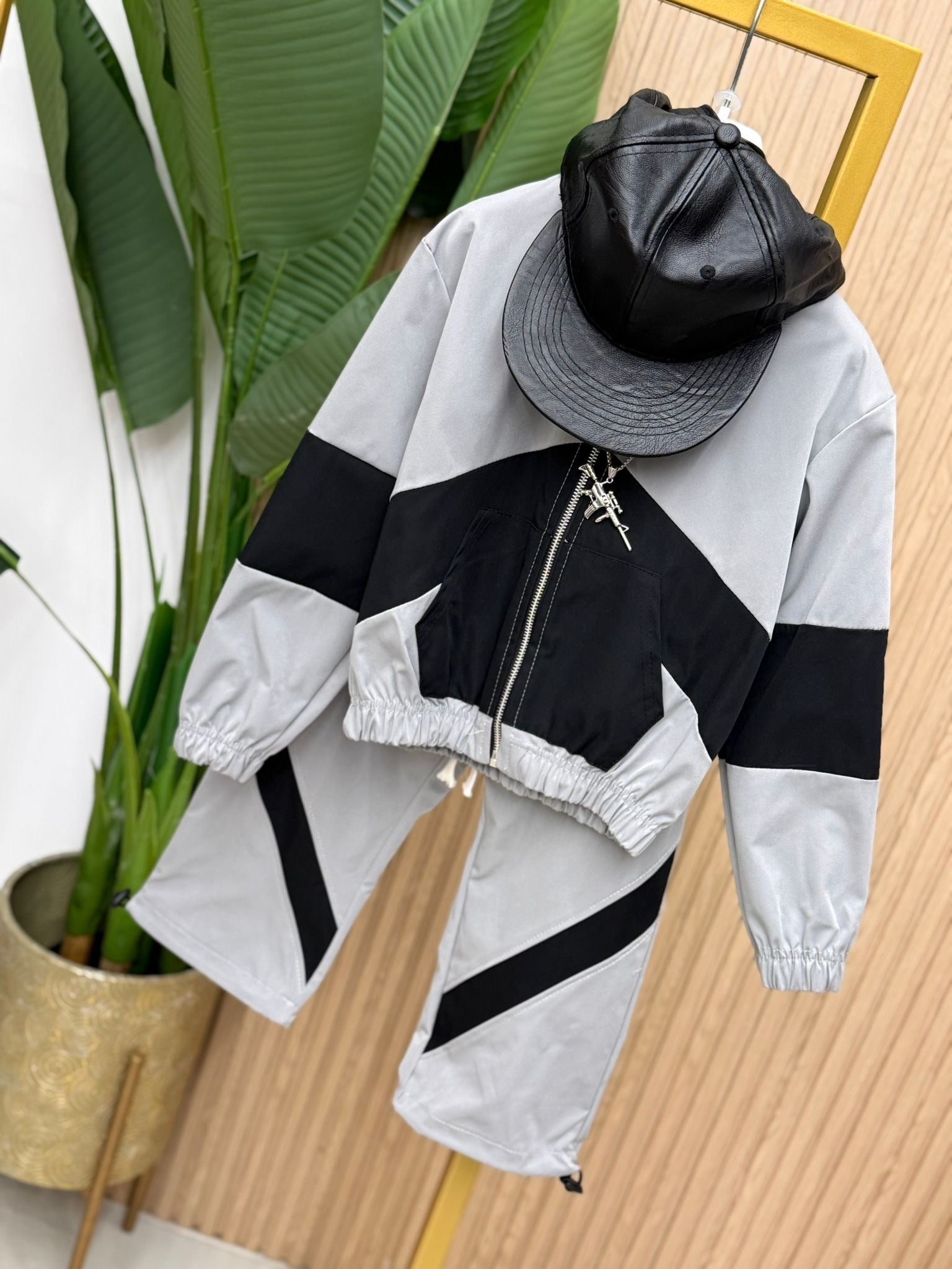 Coordinato nuova collezione primavera estate, compreso di pantalone a palazzo con lacci e giacca con zip.