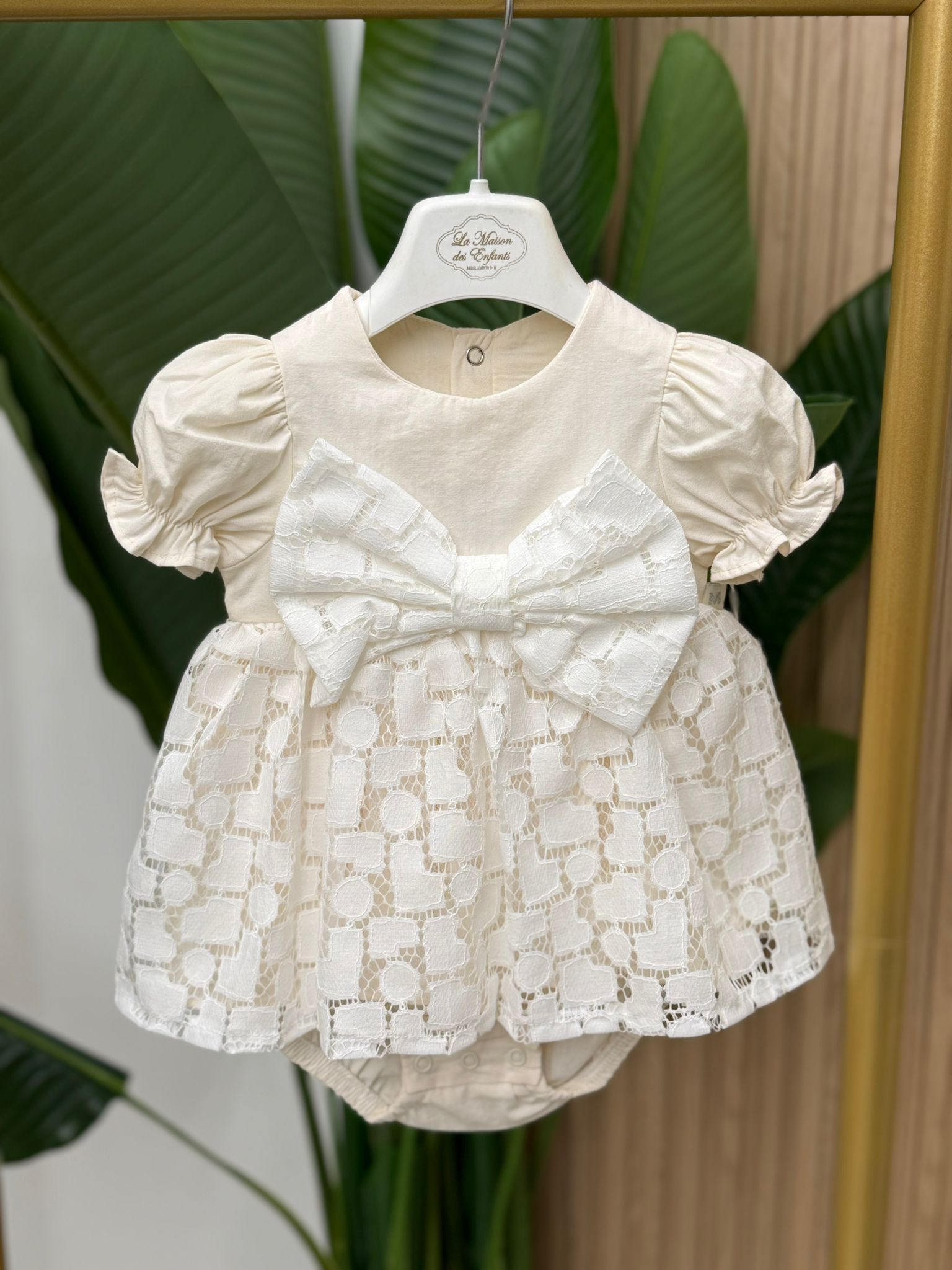 Pagliaccetto nuova collezione primavera estate,con gonna merlettata, fiocco grande sul davanti e maniche a sbuffo.